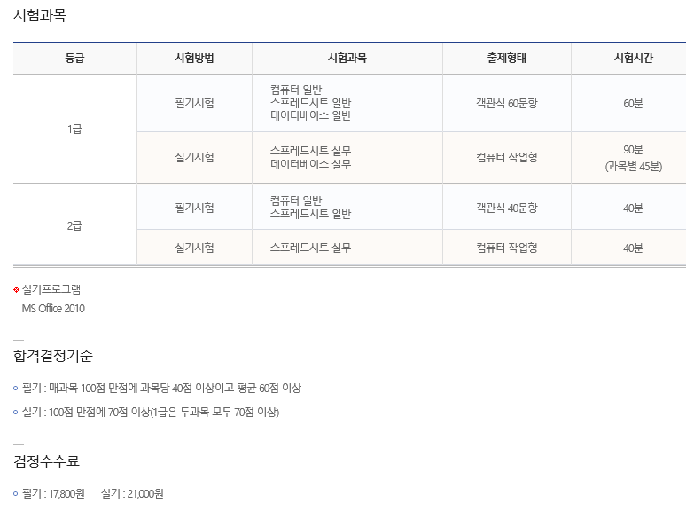 스프레드시트, 즉 엑셀과 관련한 시험만 보는 것을 알 수 있습니다.