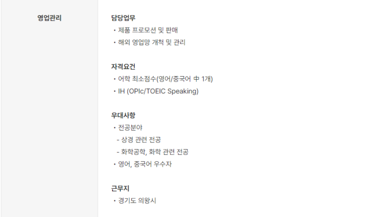 나의 경우 롯데케미칼 첨단소재 영업관리 직무의 핵심 역량으로는 글로벌, 분석력을 언급했다. 롯데케미칼 매출 분포를 보면 알 수 있듯이 대부분의 사업이 모두 해외에서 이루어진다. 그렇다보니 영업관리 직무 수행에 있어 영어가 굉장히 중요하며, 이는 아래의 채용 공고에서 자격요건과 우대사항에 영어가 기재된 것에서도 확인할 수 있다. 그러니 영업관리 직무에서 가장 중요한 역량 하나를 꼽자면 글로벌(외국어를 활용해 외국인 동료들과의 협력을 이끌어낼 수 있는 역량)이라고 생각한다.