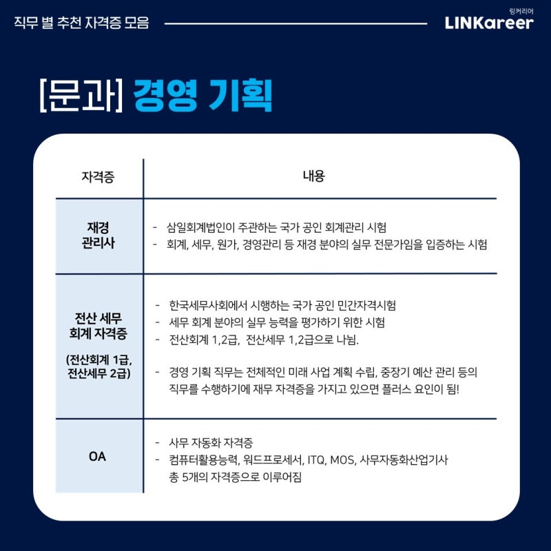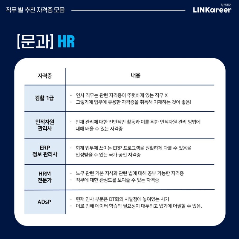 우선 문과 직무 별 추천 자격증을 먼저 소개해드릴게요!