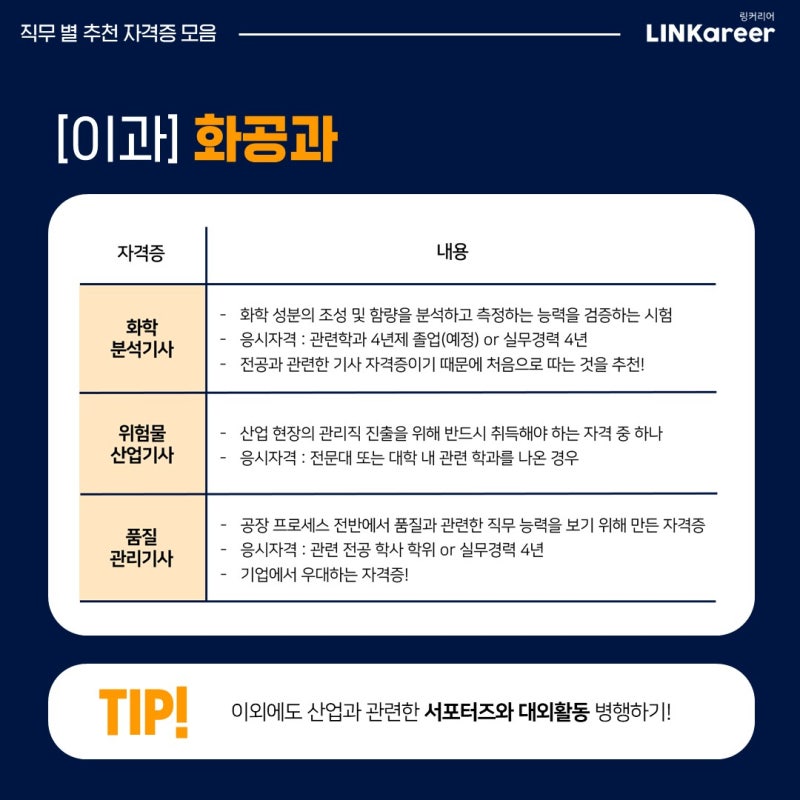 화공과의 경우 화학 분석기사, 위험물 산업기사, 품질 관리기사를 추천드리고 있습니다.
