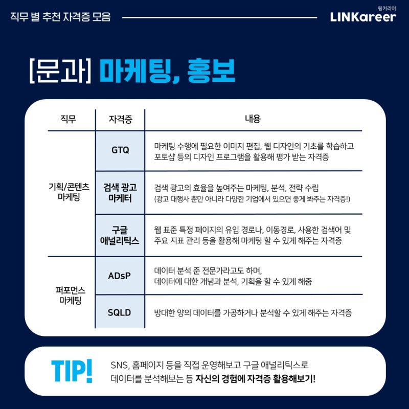 첫번째는 마케팅, 홍보 직무에 필요한 자격증 목록입니다.