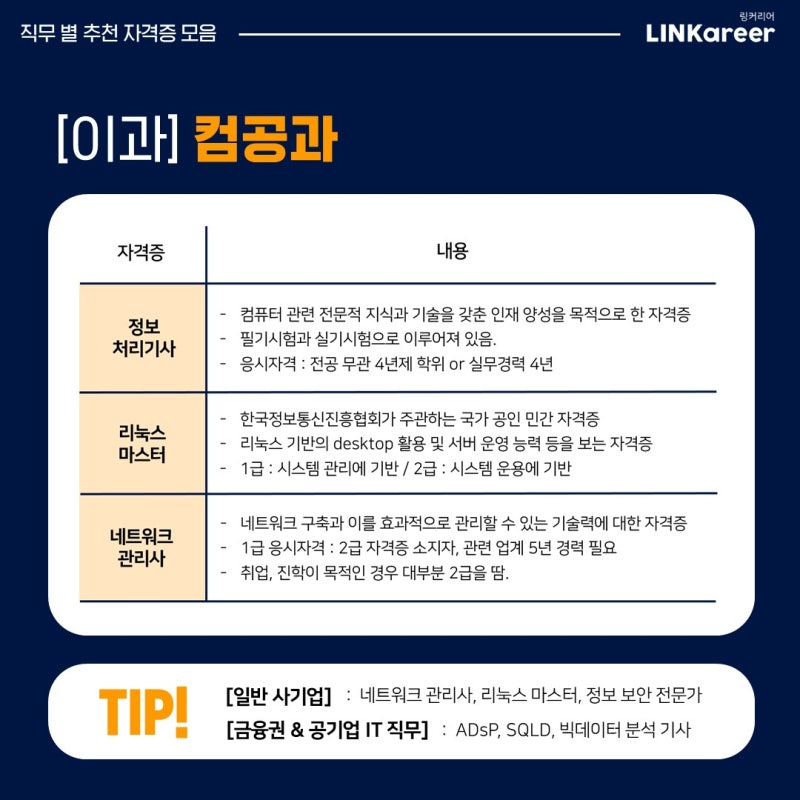 컴공과 추천 자격증의 경우 정보처리기사, 리눅스 마스터, 네트워크 관리사까지 총 3가지의 자격증을 추천드리고 있습니다.