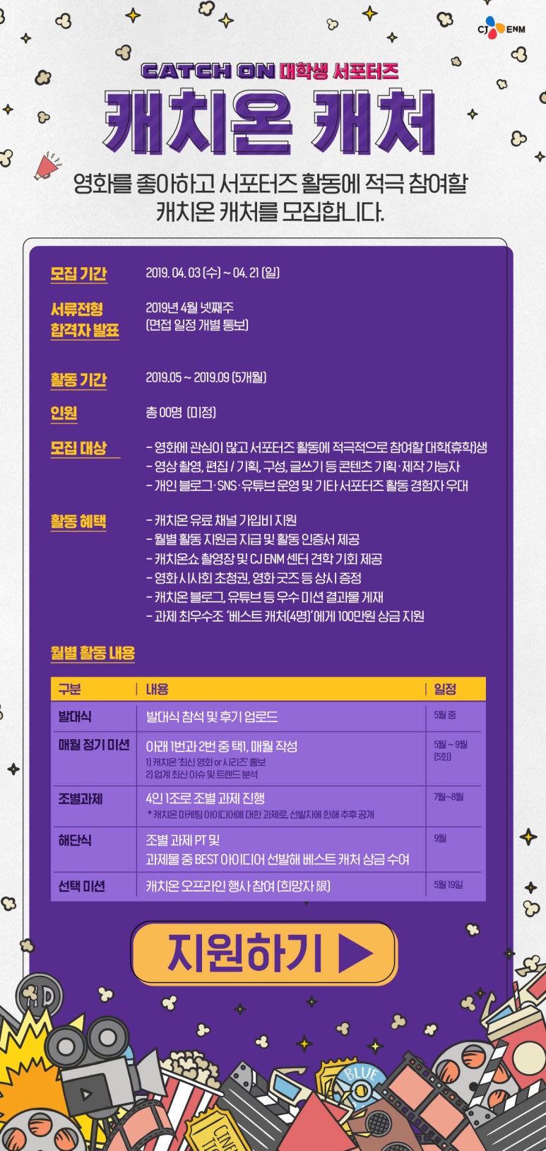 캐치온 캐처는 CJ ENM에서 서비스 중인 유료 영화 채널 캐치온 대학생 서포터즈입니다.